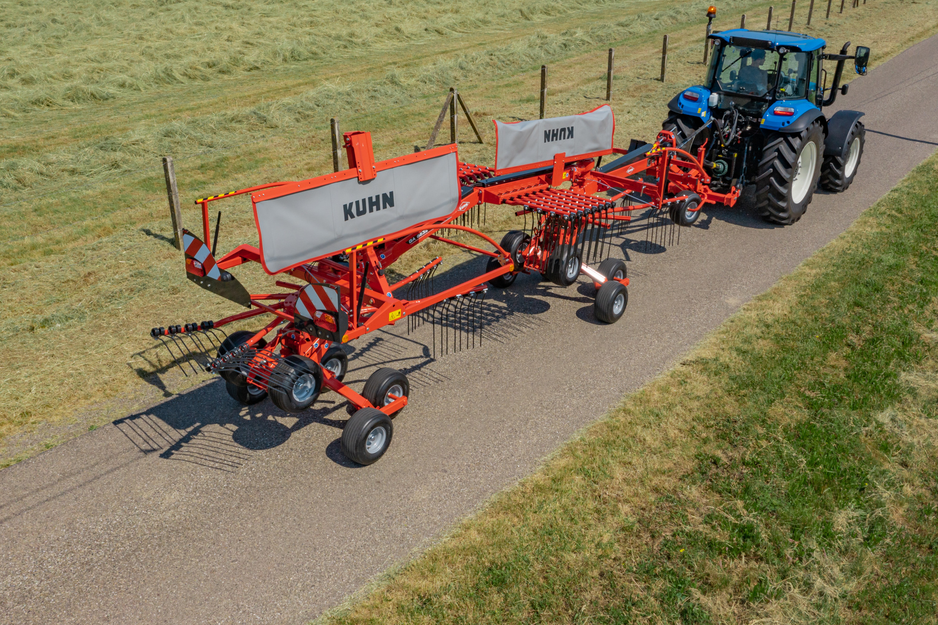 Změna z pracovní do přepravní polohy je snadná z kabiny traktoru, čímž se šířka modelu GA 6632+ snižuje na 3,00 m, GA 7932+ na 3,50 m a GA 9032+ na 4,10 m. Všechny tři modely jsou vybaveny odnímatelnými rameny pro jízdní komfort a naprostou bezpečnost, pro dlouhé cesty a skladování na těžko přístupných místech. Shrnovač vyhovuje silničním předpisům platným v některých zemích, aniž by bylo nutné demontovat ramena prstů pro přepravu. Můžete také zmenšit šířku skladu pro optimální využití prostoru v budovách.