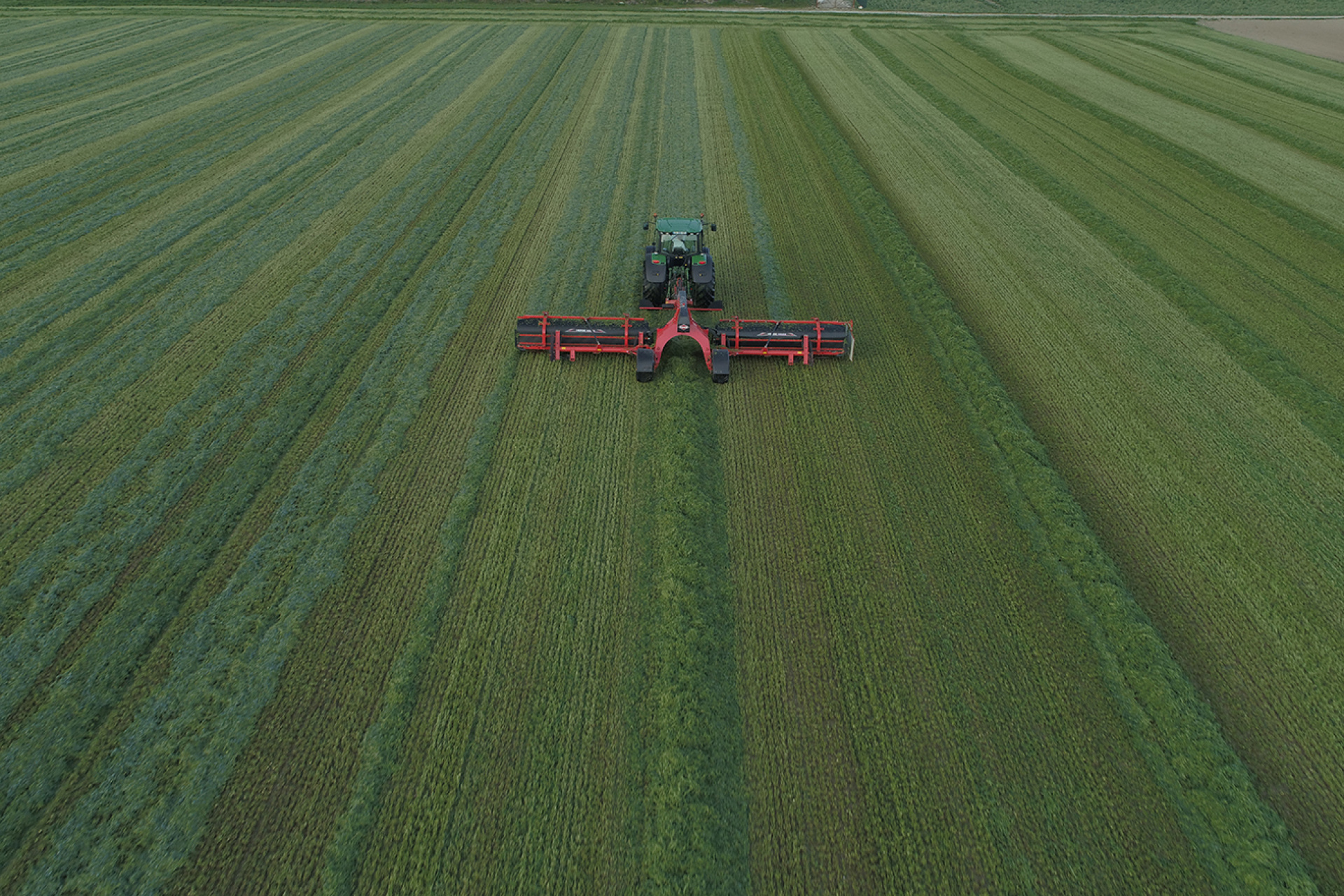 Dvě krajní sběrací jednotky dopravují píci směrem ke středu stroje, čímž vzniká centrální řádek o záběru 8 až 10 metrů.
