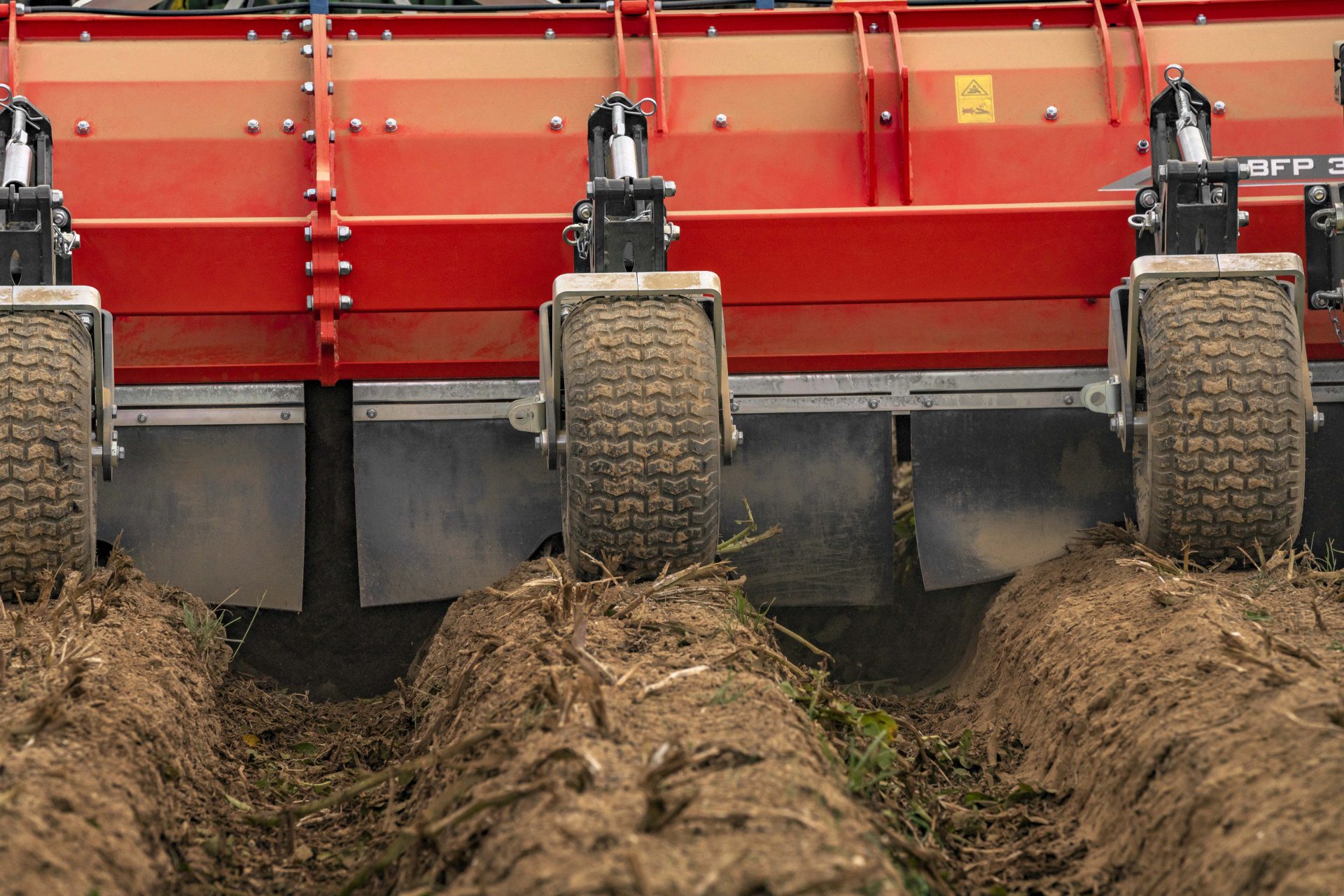 Volitelná přítlačná kola zpevňují hrouby a zároveň chrání brambory před přímým slunečním zářením.