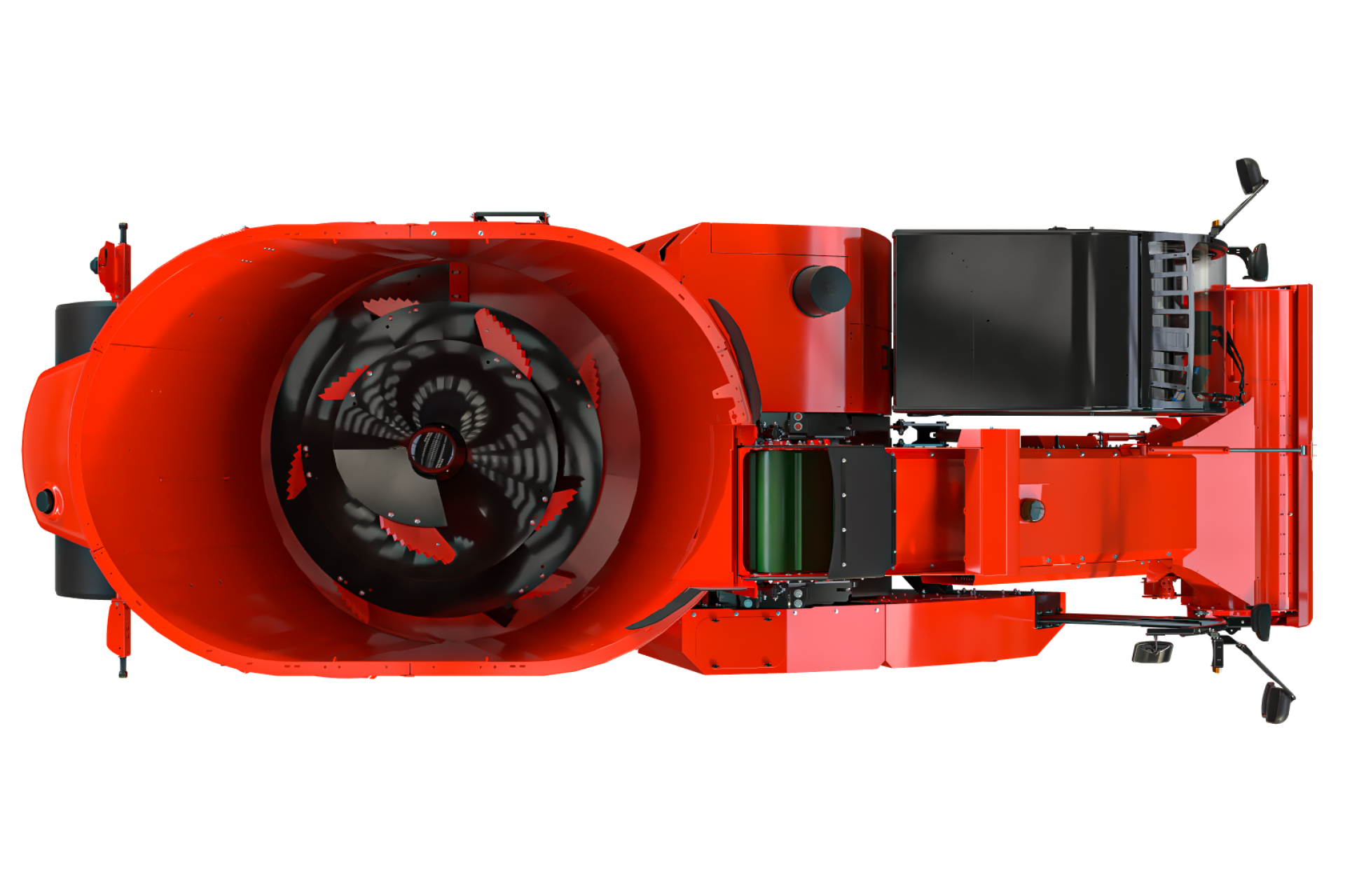 Hydraulicky ovládaná kapota frézovací hlavy se zasouvá mimo zorné pole obsluhy, čímž nebrání výhledu během manipulace s materiálem.