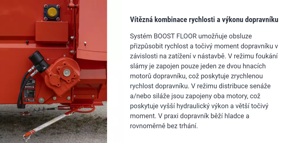 Kombinace mechanické síly a hydraulické flexibility – dodatečná síla vznikající setrvačností turbíny zajišťuje rovnoměrnou distribuci krmiva s dlouhými vlákny (senáž, seno).