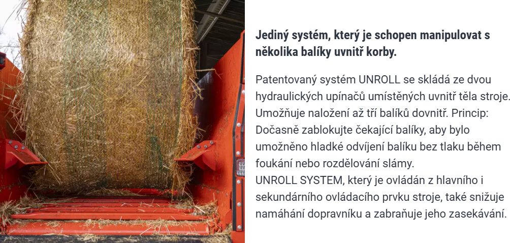 Patentovaný systém UNROLL SYSTEM (volitelně) zajišťuje optimální využití při práci s více kulatými balíky: