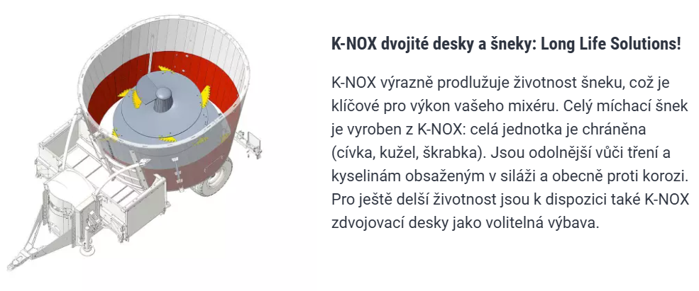 Každý šnek je vybaven pěti zubatými noži s polohou pro efekt „tažení“ řezu, což zajišťuje čisté a homogenní vlákno. Asymetrické nože poskytují samočisticí efekt při zpracování lepivého krmiva. Poslední čtvrtina otočky šneku má „dvojnásobnou“ délku, čímž se urychluje tok materiálu a zajišťuje vírový efekt při plné vaně.