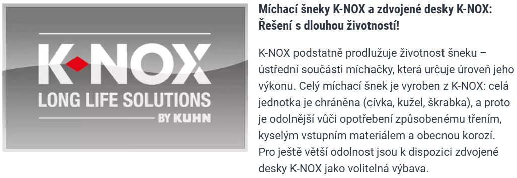 Konstrukce šneku: kontinuální spirála šneku gravituje krmivo ze dna vany nahoru bez jakýchkoli nucených pohybů. Proces míchání probíhá snadno a plynule, což zvyšuje účinnost paliva.