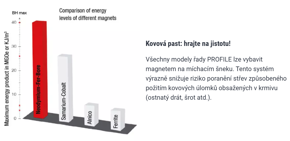 Pro snížení spotřeby energie je řada PROFILE vybavena asymetrickými noži, které mají „samočisticí“ efekt, a progresivní řeznou hranu pro konstantní přenos točivého momentu. Kontinuální spirála šneku přirozeně posouvá krmivo ze dna vany nahoru pro rovnoměrné promíchání bez nucených pohybů, což snižuje spotřebu paliva během nakládání a distribuce krmiva.
