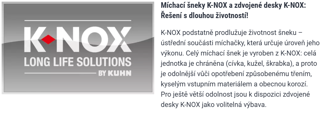 Technologie K-NOX zvýší prodejní hodnotu vašeho stroje, pokud se rozhodnete jej prodat. Použité krmné vozy se oceňují na základě opotřebení šneků, nikoli podle stáří. Stroj, jehož hlavní komponenty jsou stále v perfektním stavu, si přirozeně udrží vyšší prodejní hodnotu.