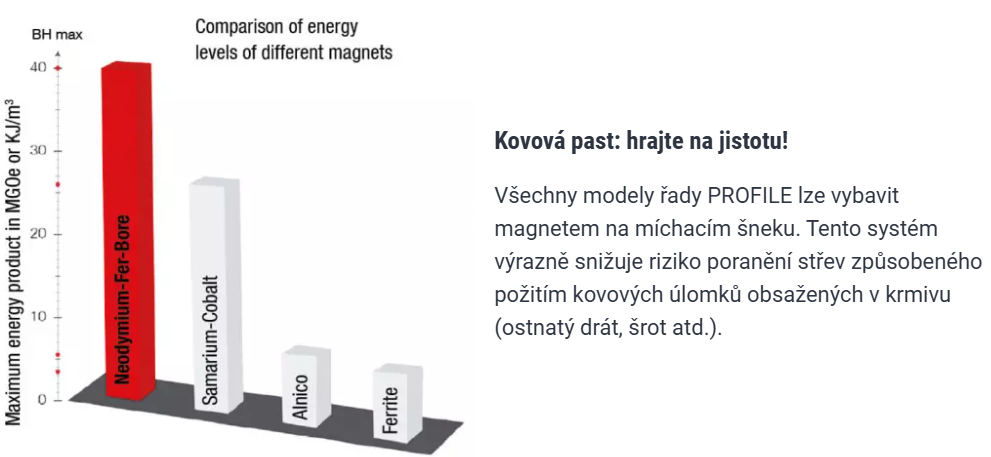 Pro snížení spotřeby energie je řada PROFILE vybavena asymetrickými noži, které mají „samočisticí“ efekt a také progresivní řeznou hranu pro konstantní přenos točivého momentu. Kontinuální spirála šneku přirozeně posouvá krmivo ze dna vany nahoru pro rovnoměrné promíchání bez nucených pohybů, což snižuje spotřebu paliva během procesu míchání.