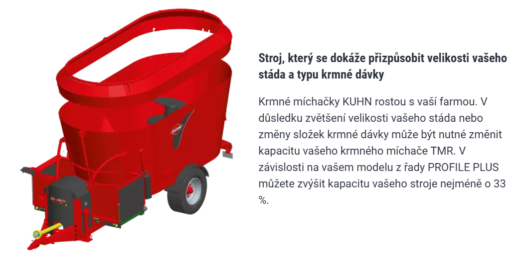 Řada PROFILE nabízí působivý výběr řešení pro distribuci krmiva, která zajišťují rovnoměrné dávkování ve všech typech budov. Ať už máte přístřešky bez samostatného východu, žlaby s okraji, velmi úzké krmné dráhy, nebo krmné stoly na obou stranách dráhy vyžadující simultánní distribuci, v řadě PROFILE najdete krmný vůz, který odpovídá vašim potřebám.
