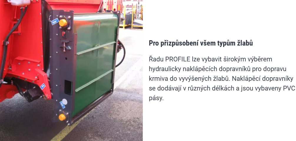 Krmný vůz PROFILE lze vybavit širokým výběrem hydraulicky naklápěcích dopravníků, které umožňují dopravu krmiva do vyvýšených žlabů. Dopravníky jsou dostupné v různých délkách a mají odolné PVC pásy.