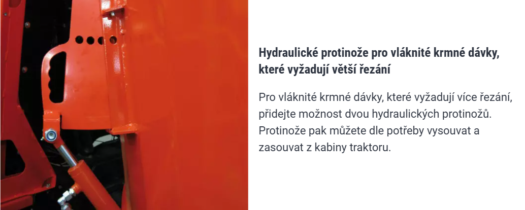 Díky diagonálnímu uspořádání protinoží vůči ose šneku a jejich propojení v horní části se snižuje prostor mezi protinožem a šnekem a zvětšuje se kontaktní plocha s krmivem. Výsledkem je rychlejší řezání delší píce a kratší doba míchání, což šetří čas a zvyšuje efektivitu při přípravě krmné dávky.