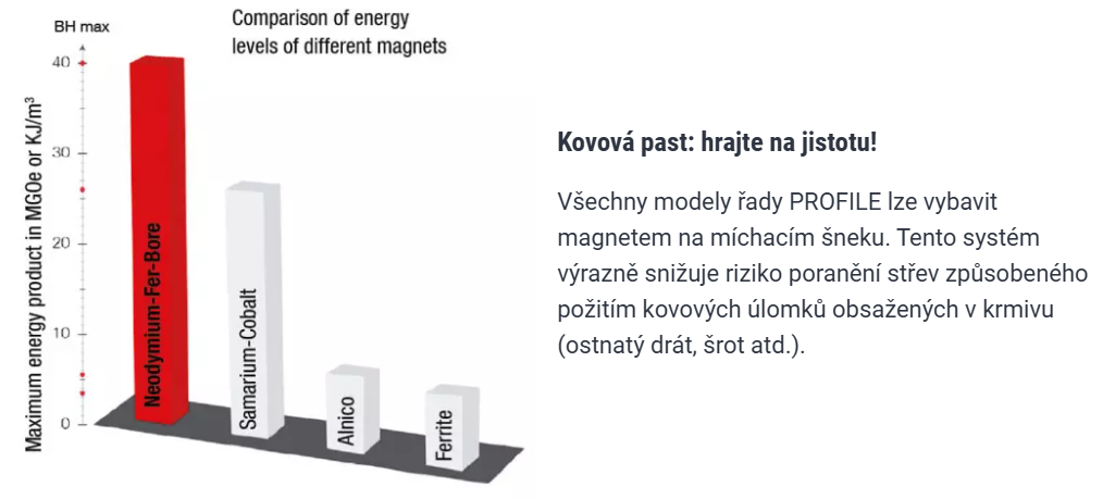 Dvojitý úhel sklonu šneku u řady PROFILE umožňuje rychlé a efektivní rozmělnění krmiva, a to i při plně naplněné vaně.