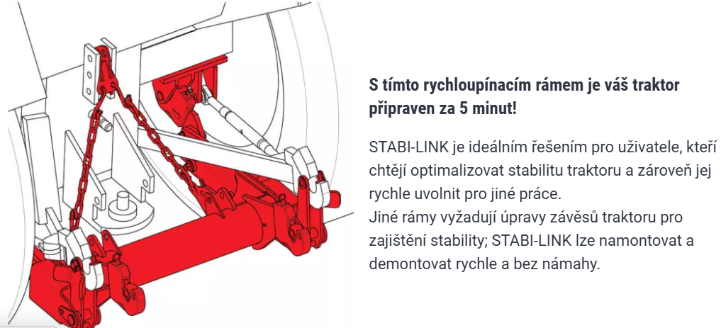 Systém hydraulické ochrany proti naklánění automaticky kompenzuje změny těžiště ramene, čímž zvyšuje stabilitu celé soupravy a eliminuje riziko převrácení traktoru.