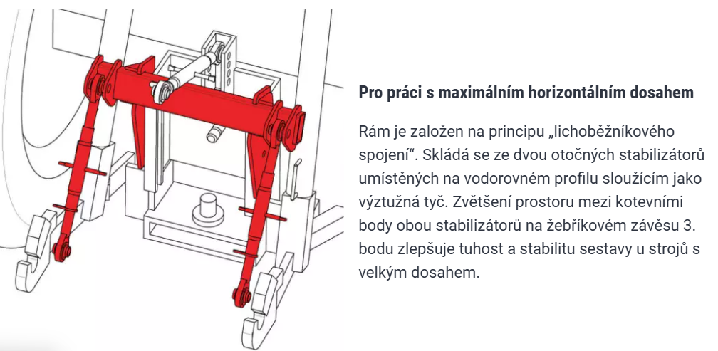 Modely s paralelogramovým uchycením navíc umožňují práci i přes vyšší překážky, díky optimálně umístěnému kotevnímu bodu ramene na kolébce.