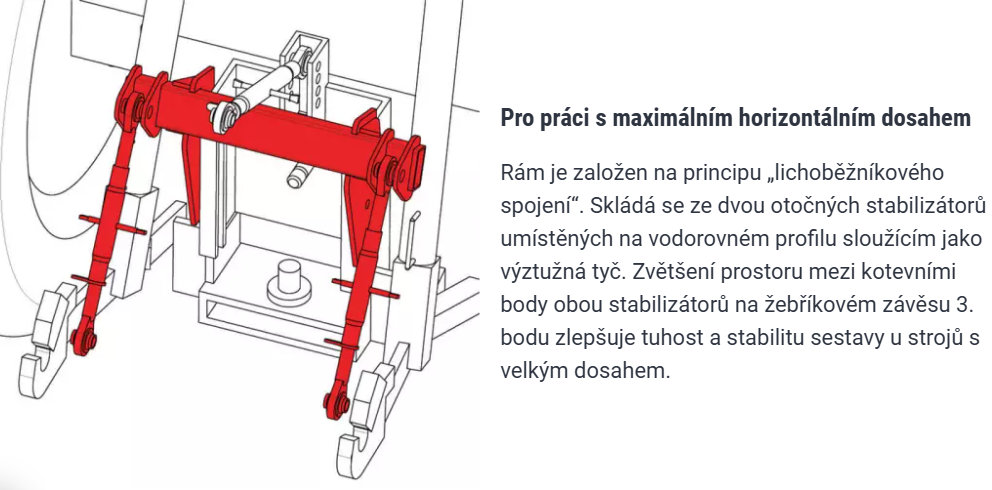 Závěsný rám umožňuje přesné a stabilní umístění cepové hlavy na rameni.