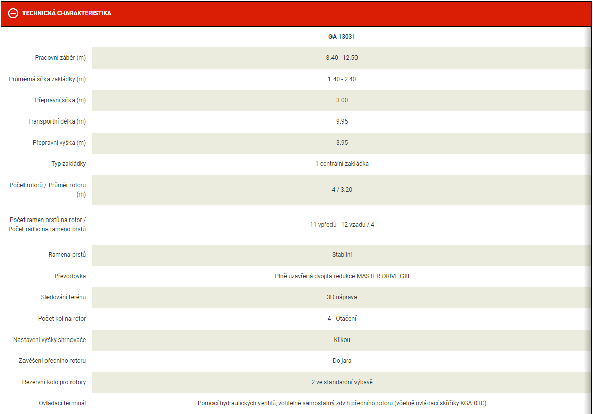 Jednoduchost a pracovní výkon jsou klíčovými body GA 13031. S nastavitelným pracovním záběrem mezi 8,40 a 12,50 m je dokonalým strojem pro vysoký pracovní výkon. 100% hydraulický pohon a rotory MASTERDRIVE GIII zajišťují dlouhou životnost stroje v těžké a husté pícnině rok co rok. 3D členění rotorů, kola nejblíže k prstům, hypertangenciální ramena, spouštění s "hyper efektem", to vše jsou výhody pro vynikající kopírování terénu, omezení zapracování nečistot a vytváření homogenních řádků.