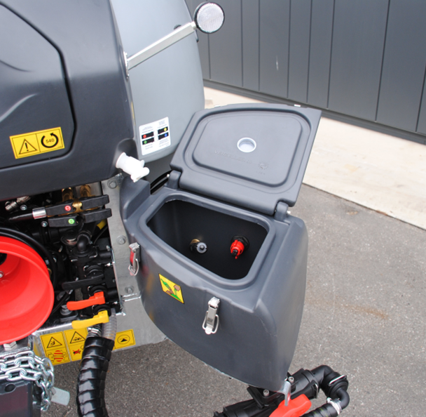 Volitelná chemická přimíchávací nádrž umožňuje pohodlné doplňování přípravků bez nutnosti zvedat těžké kanistry nad nádrž. Miska má oplachovač obalů a integrované trysky pro rovnoměrné promíchání.