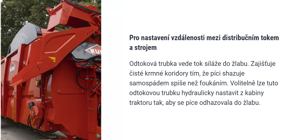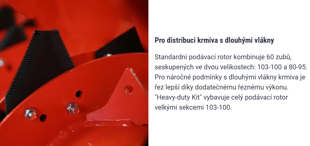 Kombinace mechanické síly a hydraulické flexibility – dodatečná síla vznikající setrvačností turbíny zajišťuje rovnoměrnou distribuci krmiva s dlouhými vlákny (senáž, seno).