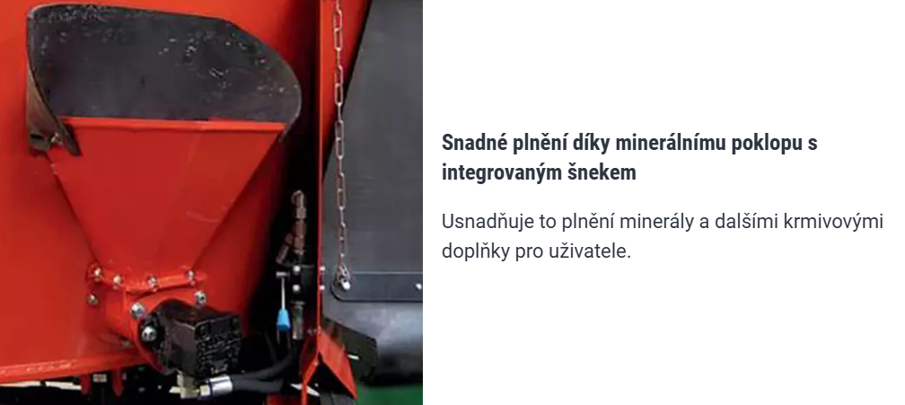 Tento design umožňuje snadné a rychlé dávkování krmiva i v omezených prostorech, aniž by byla ohrožena bezpečnost nebo výkon stroje.