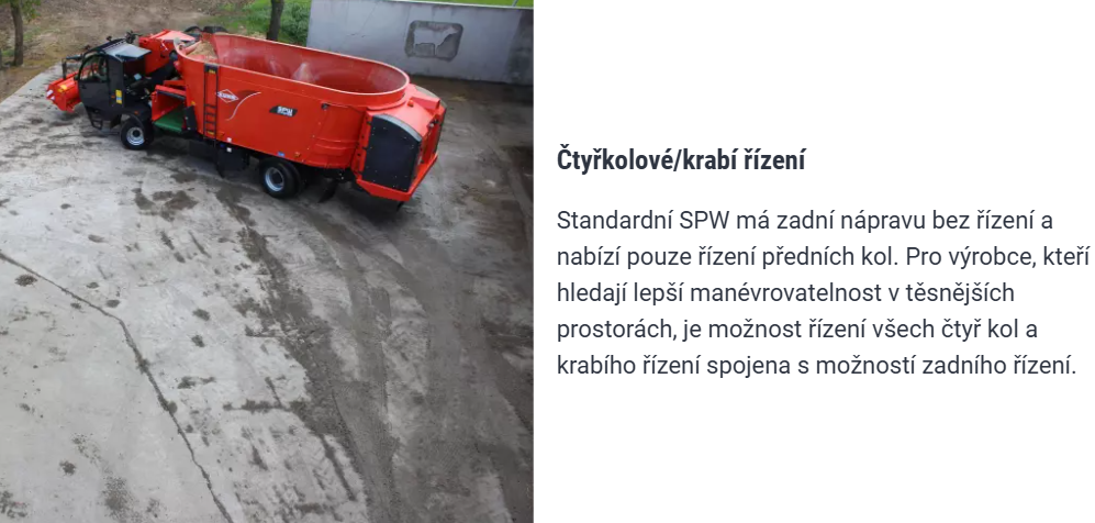 Samohybné krmné vozy SPV Access / Power / Intense mají inovativní konstrukci s zadní řídicí nápravou, která umožňuje ostré zatáčky s poloměrem 5,9 m. To usnadňuje manévrování v úzkých krmných uličkách i v silech po naložení.
