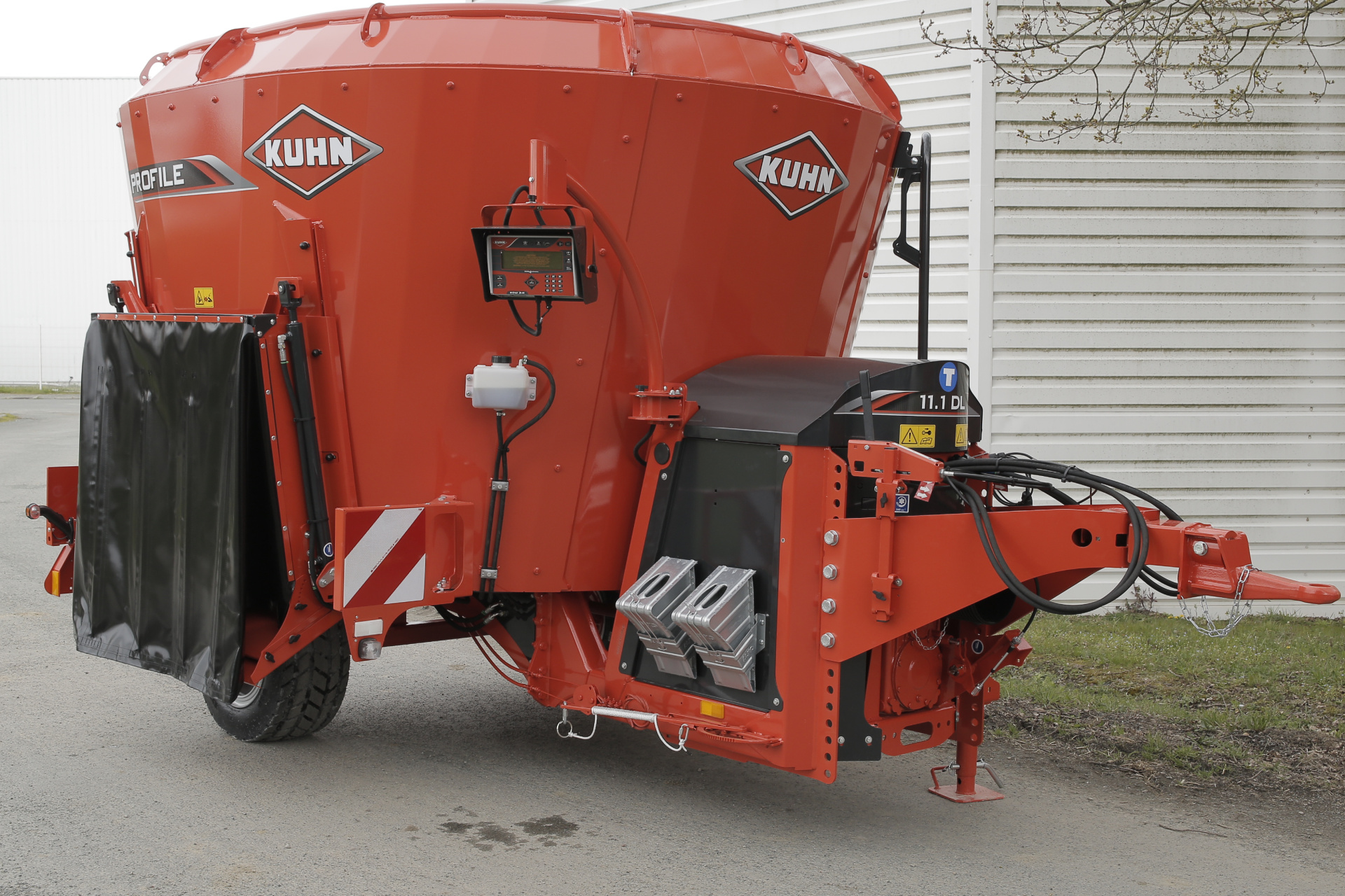 Míchací vůz je vybaven vychylovacím plechem, který zabraňuje přejetí krmiva přes otvor, a ochrannou plachtou, která brání vyčnívání krmiva za žlab, čímž je zajištěna přesnost a čistota při krmení.