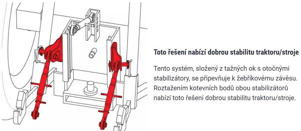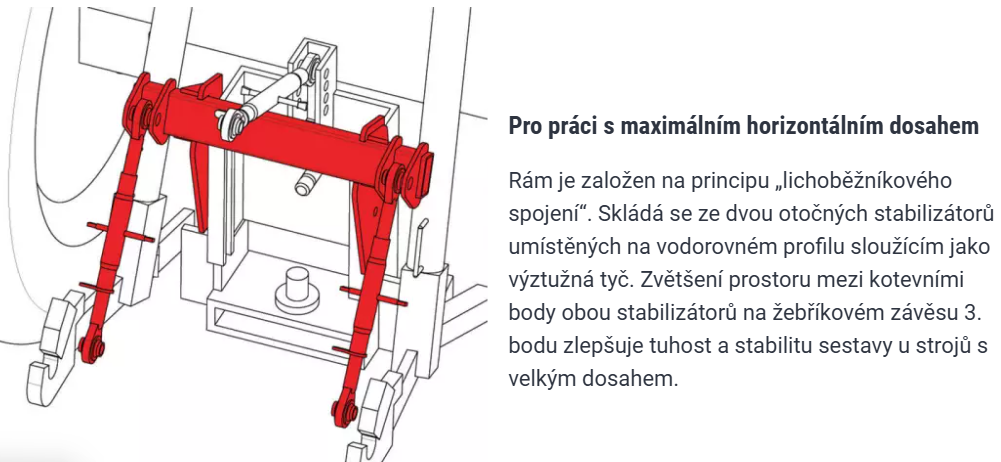 Systém hydraulické ochrany proti naklánění automaticky kompenzuje změny těžiště ramene, čímž zvyšuje stabilitu celé soupravy a eliminuje riziko převrácení traktoru.