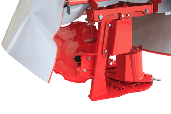 Žací stroje řady GMD 105 jsou standardně vybaveny zesíleným vnějším propojením mezi rámem a žací lištou. Toto robustní spojení je osazeno dvěma gumovými silentbloky, které účinně tlumí rázy a udržují stabilitu lišty i v náročných podmínkách nebo při jízdě po nerovných cestách.