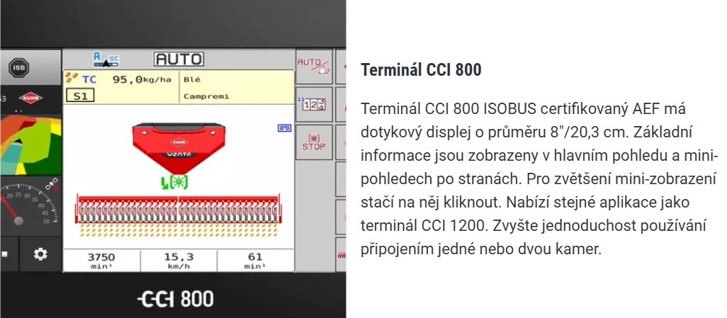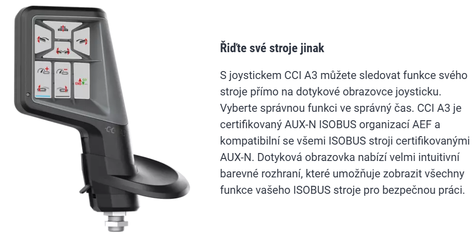 Funkce AUX-N – díky certifikaci AEF lze používat joystick CCI A3 pro zobrazení všech řídicích funkcí stroje na dotykové obrazovce a volbu správné funkce ve správný čas.